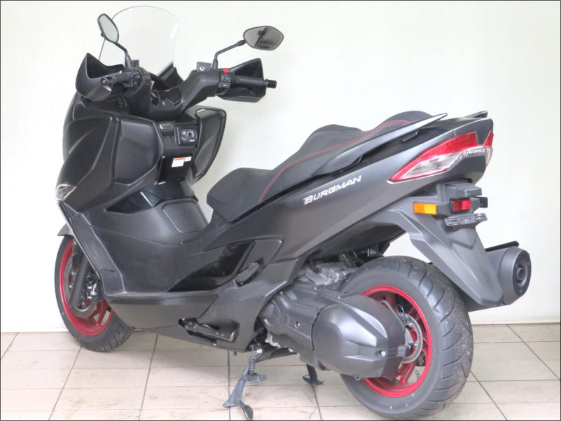 Der 400er aus der legendären Burgmanbaureihe hat ein super Fahrwerk mit Doppelscheiben-bremsen und ABS. Der kräftige Motor sorgt im Zusammenspiel mit der Variomatic für souveränes, entspanntes Fahren in- und außerhalb der Stadt. Zusätzlich zur Serienausstattung sind große Handschützer und Heizgriffe montiert.